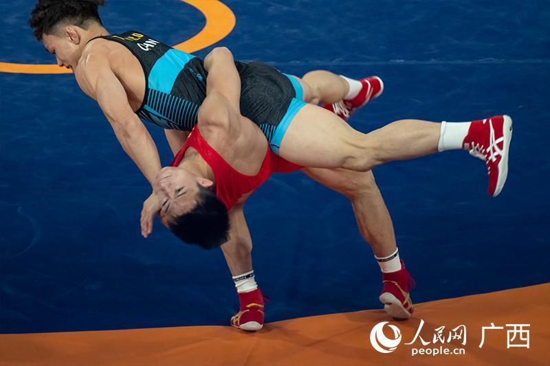 广西选手曹利国(下)在比赛中抱摔敌手。东说念主民网 雷琦竣摄