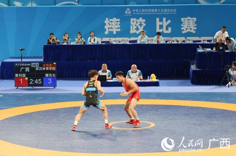 一记绝招“提抱过胸”将敌手稳摔于垫,广西选手曹利国终了迎风翻盘,全场陡然振作,高唱震天。这高光一幕,定格在11月12日第十五届寰宇引导会须眉古典式摔跤60公斤级比赛现场。